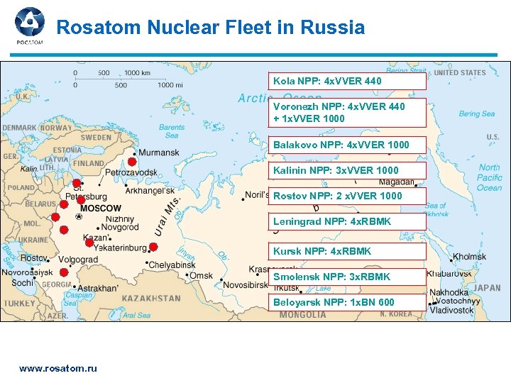 Rosatom Nuclear Fleet in Russia Kola NPP: 4 x. VVER 440 Voronezh NPP: 4 x. VVER 440 + 1 x. VVER 1000 Balakovo NPP: 4 x. VVER 1000 Kalinin NPP: 3 x. VVER 1000 Rostov NPP: 2 x. VVER 1000 Leningrad NPP: 4 x. RBMK Kursk NPP: 4 x. RBMK Smolensk NPP: 3 x. RBMK Beloyarsk NPP: 1 x. BN 600 www. rosatom. ru