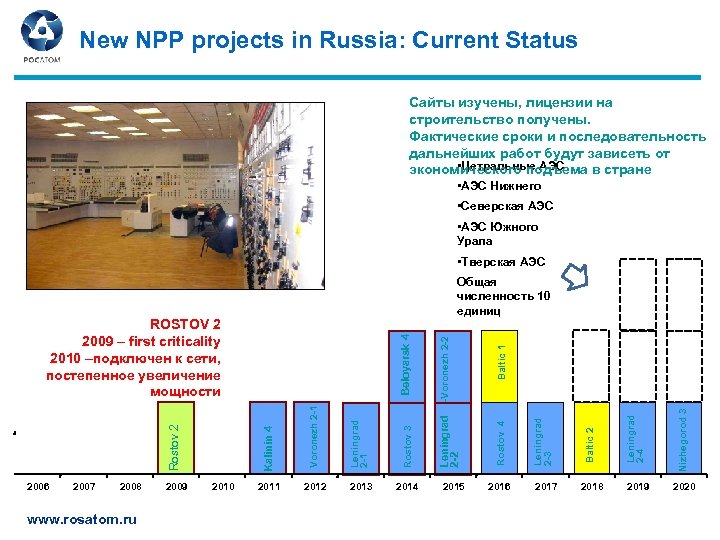 New NPP projects in Russia: Current Status Сайты изучены, лицензии на строительство получены. Фактические сроки и последовательность дальнейших работ будут зависеть от • Цетральные АЭС экономического подъема в стране • АЭС Нижнего • Северская АЭС • АЭС Южного Урала • Tверская АЭС www. rosatom. ru 2015 Baltic 1 2016 2017 2018 2019 Nizhegorod 3 2014 Leningrad 2 -4 2013 Baltic 2 2012 Rostov 4 2011 Leningrad 2 -3 2010 Rostov 3 2009 Leningrad 2 -1 2008 Voronezh 2 -1 2007 Leningrad 2 -2 Kalinin 4 Rostov 2 2006 Beloyarsk 4 ROSTOV 2 2009 – first criticality 2010 –подключен к сети, постепенное увеличение мощности -Voronezh 2 -2 Общая численность 10 единиц 2020
