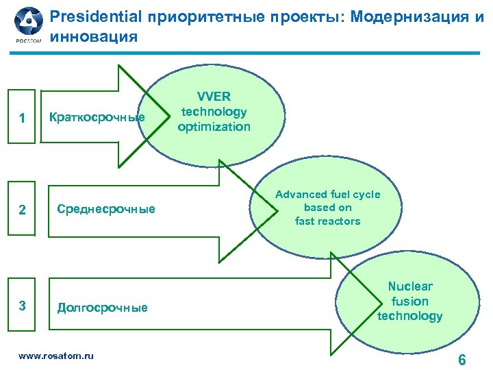 Presidential приоритетные проекты: Модернизация и инновация 1 2 3 Краткосрочные Среднесрочные Долгосрочные www. rosatom. ru VVER technology optimization Advanced fuel cycle based on fast reactors Nuclear fusion technology 6