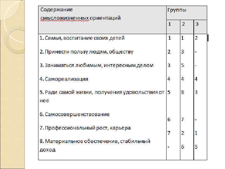 Уровни развития смысловой сферы личности: Нулевой – прагматические, ситуационные смыслы, определяемые самой предметной логикой достижения цели в конкретных целях. Данный уровень не является личностным. Эгоцентрический – первый уровень личностной смысловой сферы, в котором исходным моментом является личная выгода, удобство, престижность и т. д. Группоцентрический – смыслы ориентированы и зависят от близкого окружения человека, референтного для него или того, с которым он себя идентифицирует. Просоциальный – характеризуется внутренней смысловой устремленностью человека на создание результата, который принесет пользу и благо другим, дальним людям, обществу, человечеству в целом.