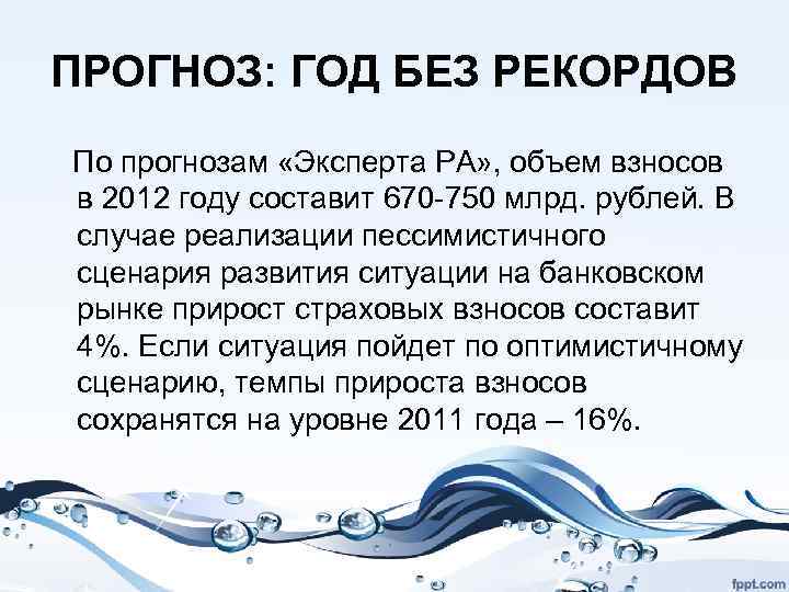 ПРОГНОЗ: ГОД БЕЗ РЕКОРДОВ По прогнозам «Эксперта РА» , объем взносов в 2012 году составит 670 -750 млрд. рублей. В случае реализации пессимистичного сценария развития ситуации на банковском рынке прирост страховых взносов составит 4%. Если ситуация пойдет по оптимистичному сценарию, темпы прироста взносов сохранятся на уровне 2011 года – 16%.