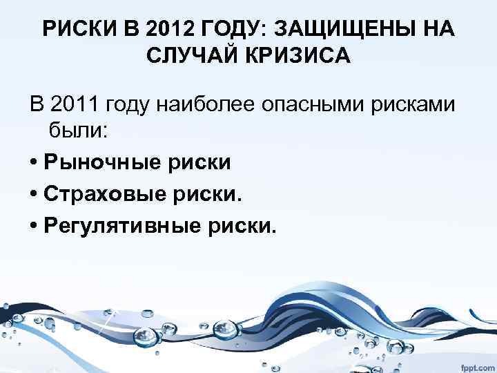 РИСКИ В 2012 ГОДУ: ЗАЩИЩЕНЫ НА СЛУЧАЙ КРИЗИСА В 2011 году наиболее опасными рисками были: • Рыночные риски • Страховые риски. • Регулятивные риски.