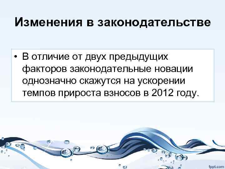 Изменения в законодательстве • В отличие от двух предыдущих факторов законодательные новации однозначно скажутся на ускорении темпов прироста взносов в 2012 году.