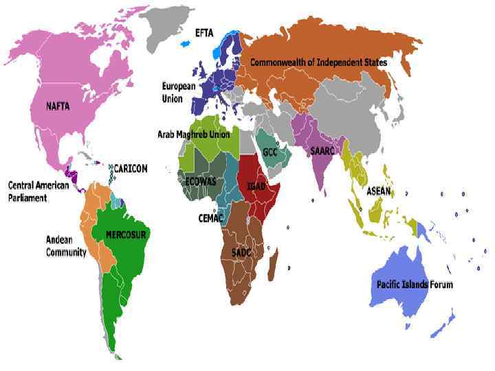 СРАВНИТЕЛЬНЫЕ ХАРАКТЕРИСТИКИ ЕС, НАФТА и АТЭС Характеристики ЕС (с 1958) НАФТА (с 1988) АТЭС (с 1989) Число стран на начало 2000 -х 16 3 21 Уровень интеграции Экономический союз Зона свободной торговли Формирование зоны свободной торговли Распределение сил внутри блока Полицентричность при общем лидерстве Германии Моноцентричность (США – абсолютный лидер) Полицентричность при общем лидерстве Японии Степень Наиболее низкая разнородности странучастниц Средняя Наиболее высокая Развитие органов наднационального управления Система органов наднационального управления (Совет ЕС, Европейская комиссия, Европарламент) Специальных органов наднационального управления нет Органы наднационального управления уже есть, но не играют большой роли Доля в мировом экспорте в 1997 40% 17% 42%(без стран НАФТА – 26%)