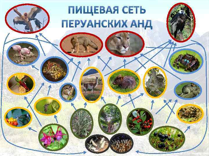 Детритные пищевые цепи Детрит Падаль Личинка москита Сумчатый опоссум Горная вискаша Андский кондр Серая древесная лисица