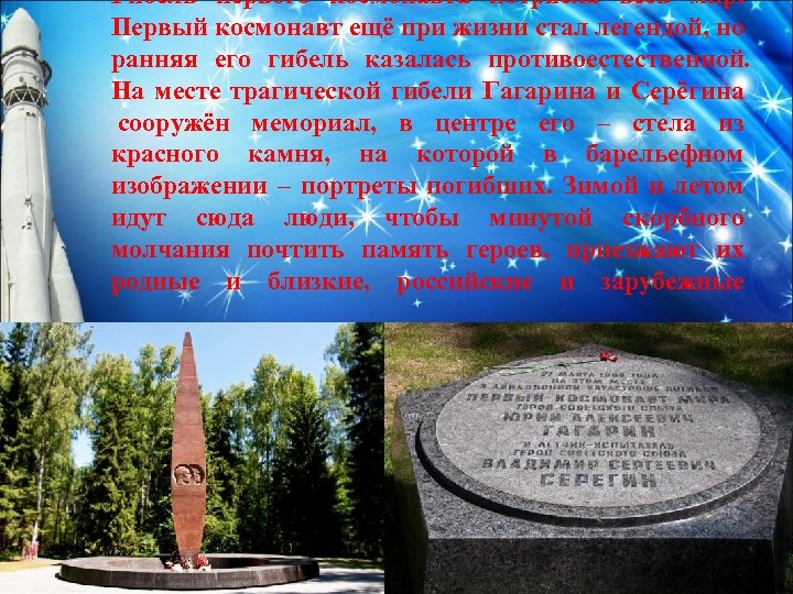 Гибель первого космонавта потрясла весь мир. Первый космонавт ещё при жизни стал легендой, но ранняя его гибель казалась противоестественной. На месте трагической гибели Гагарина и Серёгина сооружён мемориал, в центре его – стела из красного камня, на которой в барельефном изображении – портреты погибших. Зимой и летом идут сюда люди, чтобы минутой скорбного молчания почтить память героев, приезжают их родные и близкие, российские и зарубежные космонавты.