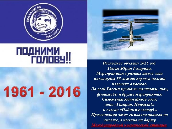 1961 - 2016 Роскосмос объявил 2016 год Годом Юрия Гагарина. Мероприятия в рамках этого года посвящены 55 -летию первого полета человека в космос. По всей России пройдут выставки, шоу, флешмобы и другие мероприятия. Символика юбилейного года: знак «Гагарин. Поехали!» и слоган «Подними голову!» . Презентация этих символов прошла на высоте, а именно на борту Международной космической станции.