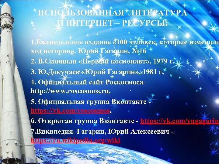 ИСПОЛЬЗОВАННАЯ ЛИТЕРАТУРА И ИНТЕРНЕТ – РЕСУРСЫ: 1. Еженедельное издание « 100 человек, которые изменили ход истории» . Юрий Гагарин, № 16 2. В. Синицын «Первый космонавт» , 1979 г. 3. Ю. Докучаев «Юрий Гагарин» , 1981 г. 4. Официальный сайт Роскосмоса- http: //www. roscosmos. ru. 5. Официальная группа Вконтакте - https: //vk. com/roscosmos. 6. Открытая группа Вконтакте - https: //vk. com/yugagarin. 7. Википедия. Гагарин, Юрий Алексеевич - https: //ru. wikipedia. org/wiki
