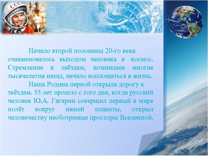 Начало второй половины 20 -го века ознаменовалось выходом человека в космос. Стремление к звёздам, возникшее многие тысячелетия назад, начало воплощаться в жизнь. Наша Родина первой открыла дорогу к звёздам. 55 лет прошло с того дня, когда русский человек Ю. А. Гагарин совершил первый в мире полёт вокруг нашей планеты, открыл человечеству необозримые просторы Вселенной.