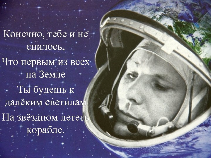 Конечно, тебе и не снилось, Что первым из всех на Земле Ты будешь к далёким светилам На звёздном лететь корабле.
