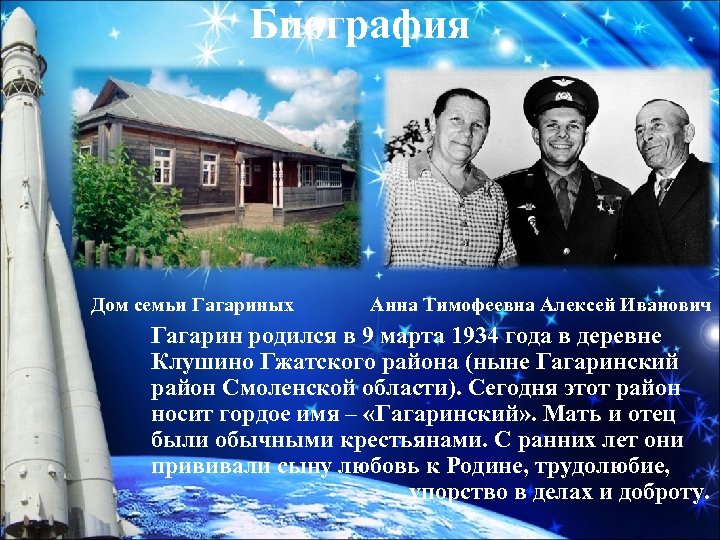 Биография Дом семьи Гагариных Анна Тимофеевна Алексей Иванович Гагарин родился в 9 марта 1934 года в деревне Клушино Гжатского района (ныне Гагаринский район Смоленской области). Сегодня этот район носит гордое имя – «Гагаринский» . Мать и отец были обычными крестьянами. С ранних лет они прививали сыну любовь к Родине, трудолюбие, упорство в делах и доброту.