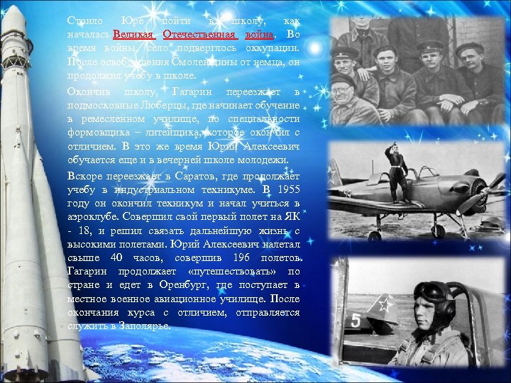 Стоило Юре пойти в школу, как началась Великая Отечественная война. Во время войны, село подверглось оккупации. После освобождения Смоленщины от немца, он продолжил учебу в школе. Окончив школу, Гагарин переезжает в подмосковные Люберцы, где начинает обучение в ремесленном училище, по специальности формовщика – литейщика, которое окончил с отличием. В это же время Юрий Алексеевич обучается еще и в вечерней школе молодежи. Вскоре переезжает в Саратов, где продолжает учебу в индустриальном техникуме. В 1955 году он окончил техникум и начал учиться в аэроклубе. Совершил свой первый полет на ЯК - 18, и решил связать дальнейшую жизнь с высокими полетами. Юрий Алексеевич налетал свыше 40 часов, совершив 196 полетов. Гагарин продолжает «путешествовать» по стране и едет в Оренбург, где поступает в местное военное авиационное училище. После окончания курса с отличием, отправляется служить в Заполярье.