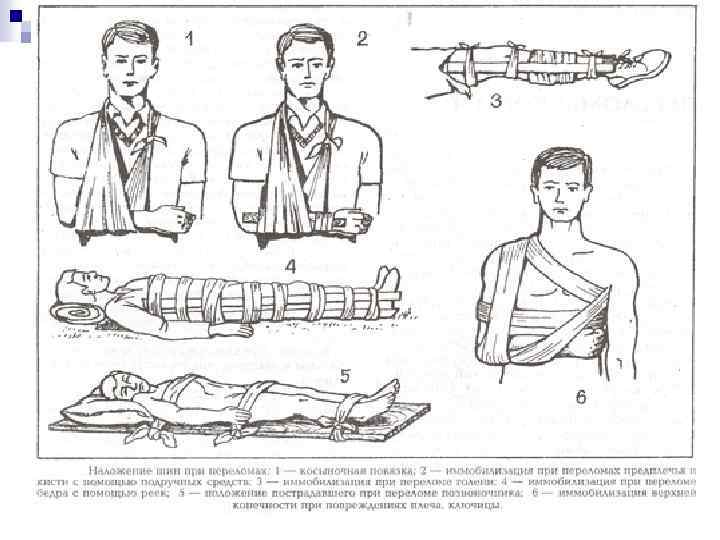 n При закрытом переломе: n Приложить холодный компресс. Поврежденную конечность уложить во временную шину, прибинтовав ее к месту перелома, чтобы не возникло смещения костей. При всех видах переломов и трещин необходимо обеспечить пострадавшему полный покой, исключающий всякие движения. НАЛОЖЕНИЕ ШИНЫ Если под рукой не оказалось специальных шин, вместо них можно воспользоваться дощечками, кусочками фанеры, палками, камышом, туго скрученной соломой. n n