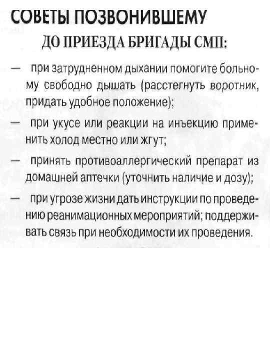 Что нужно сделать до приезда «скорой помощи» Очевидно, что нужно максимально облегчить работу выездной бригады. Так, если есть возможность, ее лучше встретить на улице, чтобы сразу пронести к больному. Следует обеспечить свободный проход в больному, удалить из комнаты детей и домашних животных, обеспечить тишину и достаточное пространство для действий бригады Желательно заблаговременно подготовить документы больного: • паспорт (свидетельство о рождении); • страховой полис (так как пациента, возможно, придется везти в стационар, работающий в рамках ОМС). Кроме того, на тот случай, если больного придется транспортировать, следует заранее решить, кто будет сопровождать его (в случае согласия бригады) и соответственно тоже подготовиться к поездке.