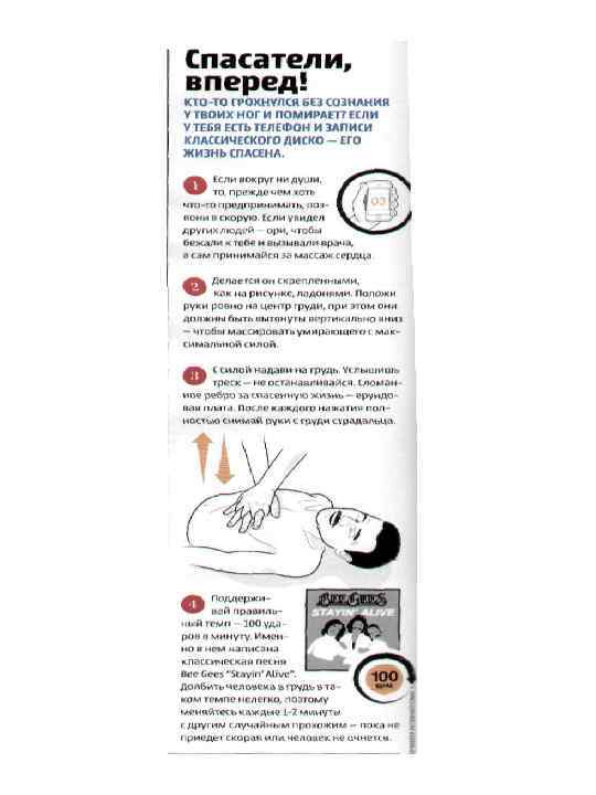 Песня Bee Gees Stayin’ Alive Помогает В Проведении Сердечно-Легочной Реанимации Американский исследователь обнаружил, что популярная песня группы Bee Gees под названием «Stayin’ Alive» , написанная в конце 1970 -х годов, помогает в обучении и проведении сердечно-легочной реанимации (СЛР). Ее ритм в 103 удара в минуту является практически идеальным для нажатий на грудную клетку при непрямом массаже сердца – Американская кардиологическая ассоциация (AHA) рекомендует проводить его с частотой 100 в минуту. По словам автора исследования Дэвида Мэтлока (David Matlock), врача кампуса школы Пеория в штате Иллинойс, многие люди не решаются в критической ситуации начать непрямой массаж сердца. Основной причиной такой нерешительности становится неуверенность в правильности ритма нажатий на грудную клетку пострадавшего. В то же время, правильно проведенная СЛР втрое повышает выживаемость при остановке сердца. Проводя исследование, Мэтлок предложил 15 студентам и врачам выполнить непрямой массаж сердца на манекене во время прослушивания «Stayin’ Alive» , причем выполнять нажатия с частотой ритм-секции песни. Через пять недель добровольцы снова провели манекену массаж сердца, но на этот раз воспроизводя мелодию мысленно. В первой части эксперимента средняя частота нажатий составила 109 в минуту, во второй – 113. Хотя это несколько превышает рекомендованный ритм, большее число нажатий при проведении СЛР предпочтительнее, чем меньшее. Оказалось, что Мэтлок был не первым, кто обратил внимание на ценность хита Bee Gees - AHA в течение последних двух лет рекомендует инструкторам по СЛР включать эту песню на занятиях. Эта рекомендация базируется на наблюдении преподавателя СЛР Виная Надкарни (Vinay Nadkarni) из Университета Пенсильвании, который с ее помощью повышал результативность обучения своих студентов. Однако до Мэтлока никто не доказал, что простой и достаточно навязчивый ритм популярного диско настолько хорошо врезается в память, что позволяет соблюдать правильную частоту массажа сердца даже без прослушивания песни во время реанимации.