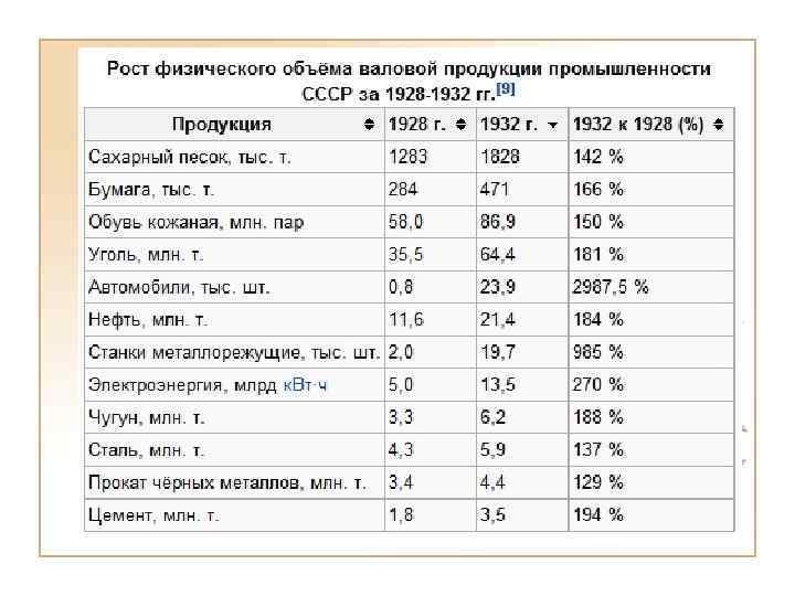 Государство перешло к централизованному распределению принадлежащих ему средств производства и предметов потребления, осуществлялись внедрение командноадминистративных методов управления и национализация частной собственности. Возникла политическая система, основанная на руководящей роли ВКП(б), государственной собственности на средства производства и минимуме частной инициативы. Первая пятилетка была связана со стремительной урбанизацией. Городская рабочая сила увеличилась на 12, 5 миллионов человек, из которых 8, 5 миллионов было из деревень. Процесс продолжал идти в течение нескольких десятилетий, так что в начале 1960 -х численность городского и сельского населения сравнялись. В конце 1932 г. было объявлено об успешном и досрочном выполнении первой пятилетки за четыре года и три месяца. Подводя её итоги, Сталин сообщил, что тяжёлая индустрия выполнила план на 108 %. За период между 1 октября 1928 г. и 1 января 1933 г. производственные основные фонды тяжёлой промышленности увеличились в 2, 7 раза.