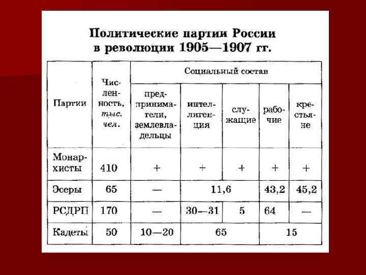 Основные события революции n n n 09. 01. 05 – «кровавое воскресенье» начало революции 12. 05 – начало стачки в Иваново-Вознесенске, появление первых Советов (длилась 72 дня) 28. 06. 05 – восстание на броненосце «Потемкин» Август 1905 г. – выборы в «булыгинскую думу» Август 1905 г. – образование Всероссийского крестьянского союза Октябрь 1905 г. – Всероссийская политическая стачка 17 октября - Манифест Декабрь 1905 г. – вооруженное восстание в Москве Январь 1906 г. – сокращение выкупных платежей Апрель- июль 1906 г. – деятельность I Государственной думы Февраль – июнь (2) 1907 г. – деятельность II Государственной думы 03. 06. 07 г. – государственный переворот (новый избирательный закон), «третьеиюньская монархия» , окончание революции