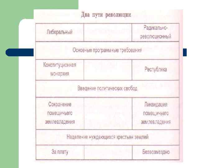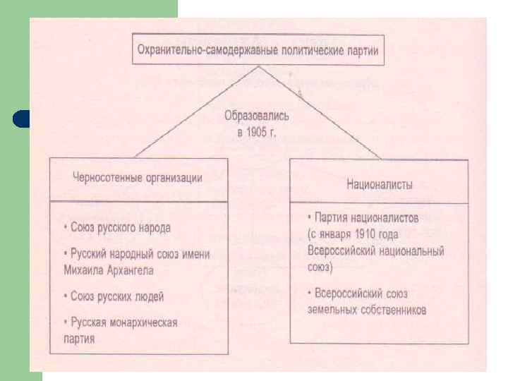 «Союз русского народа» ( «черносотенцы» ) Время создания 1905 г. Лидеры А. И. Дубровин, В. М. Пуришкевич Социальный состав Консервативно настроенные помещики, горожане, мелкие предприниматели Политические требования Незыблемость самодержавия Национальный вопрос Сохранение и неделимость империи; Возможность «свободного развития национальных культур» , но недопущение национальных школ и политических организаций; Упразднение автономии Финляндии, Русификация Кавказа и Средней Азии Аграрный вопрос Сохранение ЧС на землю, против отчуждения помещичьих земель. Право выхода из общины некоторым крестьянам по разрешению общины Методы Создание боевых дружин – «черной сотни» , организация погромов Перспективы развития России Сохранение неограниченного самодержавия
