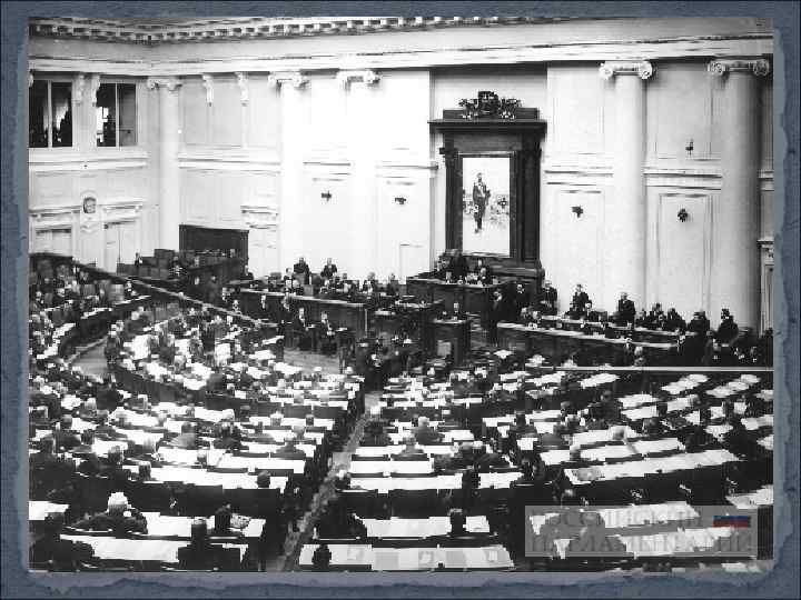 Первая ГД : 27 апреля – 8 июля 1906 г. Партия Кол-во участников Эсеры Беспартийные Кадеты 153 чел. Октябристы 13 чел. Черносот. Не прошли Соцдемократы Не участв. Трудовики 200 чел. ТРЕБОВАНИЯ: • Равные всеобщие выборы • Упразднение Гос. Совета • Гарантии гражданских свобод • Отмена смертной казни • Полная политическая амнистия • Глубокая аграрная реформа Распущена, как «сеющая смуту» .