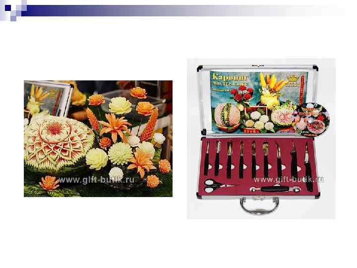 Набор для карвинга (декоративного вырезания из овощей и фруктов) Состав набора: · нож длинный; · нож серповидный; · нож тайский; · ножи треугольные: большой, средний, маленький; · ножи овальные: большой, среднмй, маленький; · ложка для вырезания; · ножницы; · DVD-диск; · учебник по карвингу (76 страниц, формат A 4).