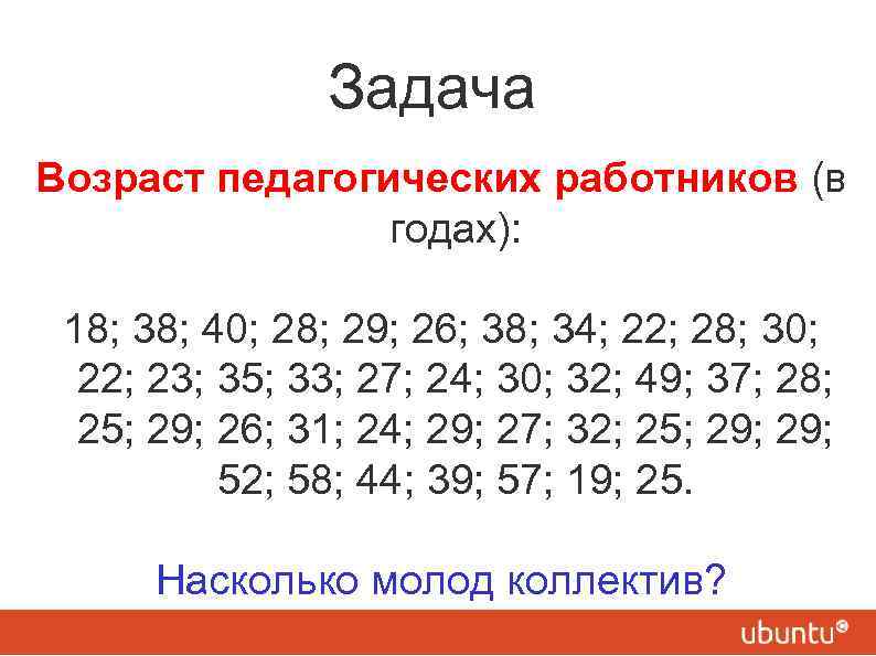 Задача Возраст педагогических работников (в годах): 18; 38; 40; 28; 29; 26; 38; 34; 22; 28; 30; 22; 23; 35; 33; 27; 24; 30; 32; 49; 37; 28; 25; 29; 26; 31; 24; 29; 27; 32; 25; 29; 52; 58; 44; 39; 57; 19; 25. Насколько молод коллектив?