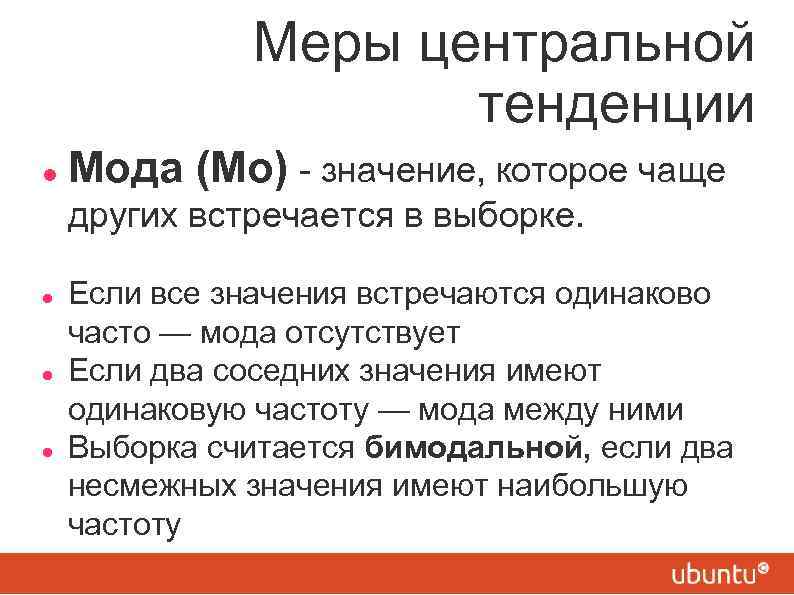 Меры центральной тенденции Мода (Мо) - значение, которое чаще других встречается в выборке. Если все значения встречаются одинаково часто — мода отсутствует Если два соседних значения имеют одинаковую частоту — мода между ними Выборка считается бимодальной, если два несмежных значения имеют наибольшую частоту