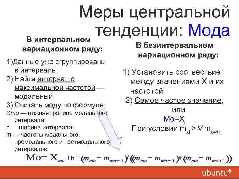 Меры центральной тенденции: Мода В интервальном вариационном ряду: 1)Данные уже сгруппированы в интервалы 2) Найти интервал с максимальной частотой — модальный 3) Считать моду по формуле: Xmo — нижняя граница модального интервала; h — ширина интервала; m — частоты модального, премодального и постмодального интервалов В безинтервальном вариационном ряду: 1) Установить соотвествие между значениями Х и их частотой 2) Самое частое значение, или Mo=Xi При условии mxi >∀mx≠xi