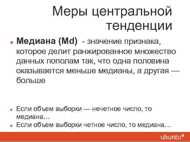 Меры центральной тенденции Медиана (Md) - значение признака, которое делит ранжированное множество данных пополам так, что одна половина оказывается меньше медианы, а другая — больше Если объем выборки — нечетное число, то медиана… Если объем выборки четное число, то медиана…