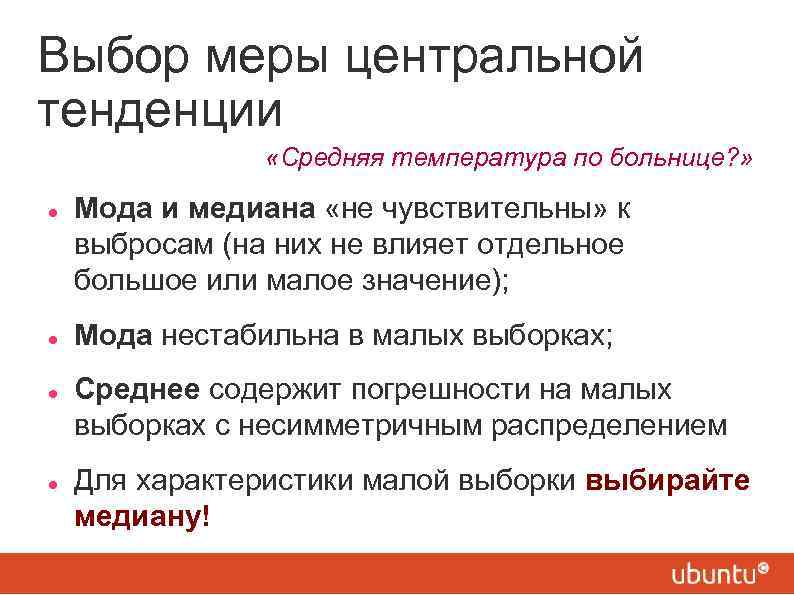 Выбор меры центральной тенденции «Средняя температура по больнице? » Мода и медиана «не чувствительны» к выбросам (на них не влияет отдельное большое или малое значение); Мода нестабильна в малых выборках; Среднее содержит погрешности на малых выборках с несимметричным распределением Для характеристики малой выборки выбирайте медиану!