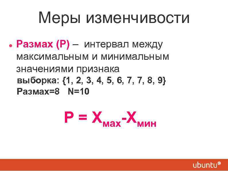 Меры изменчивости Размах (Р) – интервал между максимальным и минимальным значениями признака выборка: {1, 2, 3, 4, 5, 6, 7, 7, 8, 9} Размах=8 N=10 Р = Хмах-Хмин