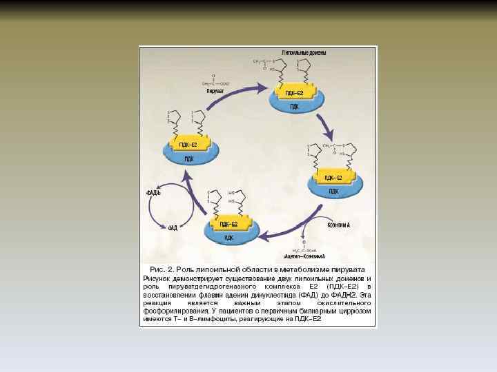 Патогенез • Механизм повреждения холангиоцитов, а затем и паренхиматозных элементов печени имеет сложный мультифакторный характер. • Прямое поражение антимихондриальными антителами E 2 пируватдегидрогензаного комплекса внутренней мембраны пируватдегидрогензаного комплекса митохондрий холангиоцитов. Предположительно, через рецептор управляемый эндоцитоз. • СD 8+ лимфоцитарная инфильтрация холангиол => прямое цитотоксическое действие на клетки через взаимодействие TCR активированных T-киллеров с HLA 1 ассоциированными эпитопами. • Индукция выработки IL 1, IL-2, ФНО-а, TGF-beta и других факторов воспаления, апоптоза и фиброгенеза.