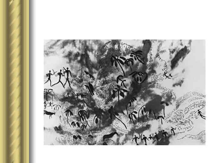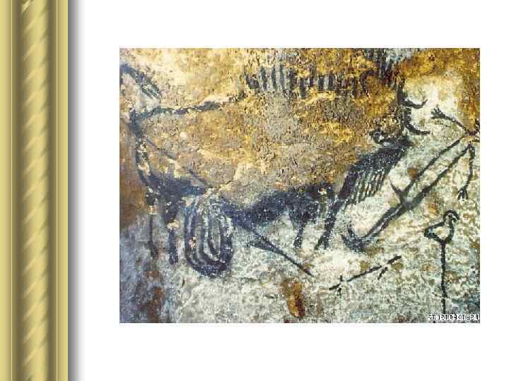 ИСКУССТВО синкретично l. Ранняя живопись – зигзагообразные линии на глине и отпечатки ладоней. l. Сначала изображения (люди и звери) - статичны (без движения), затем - движении, получили цвет, некоторую пластику и объем.