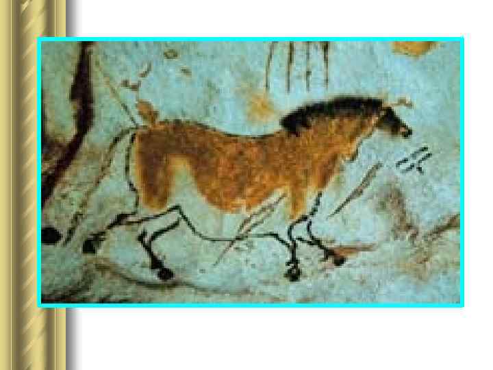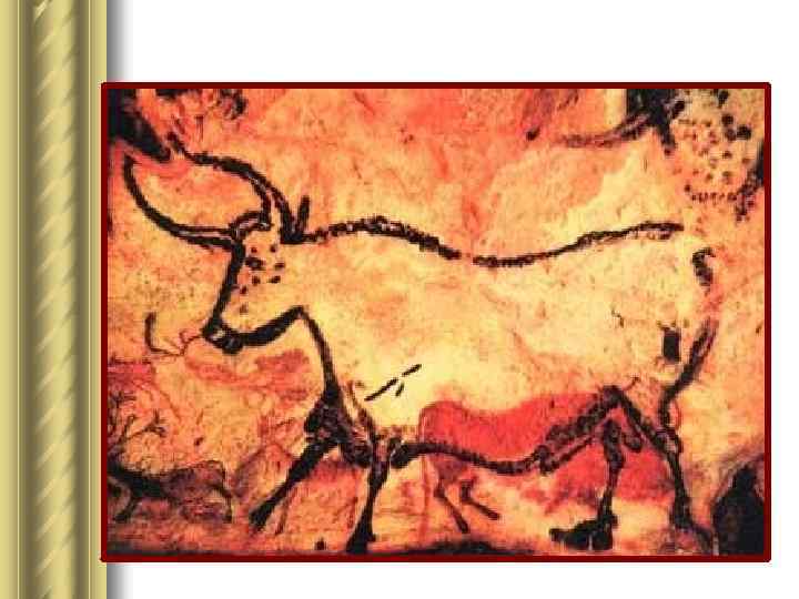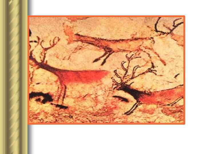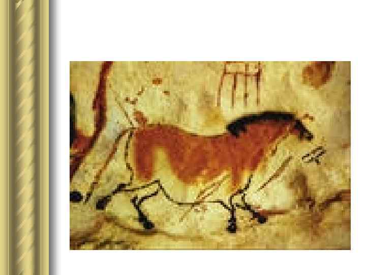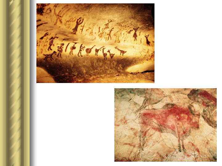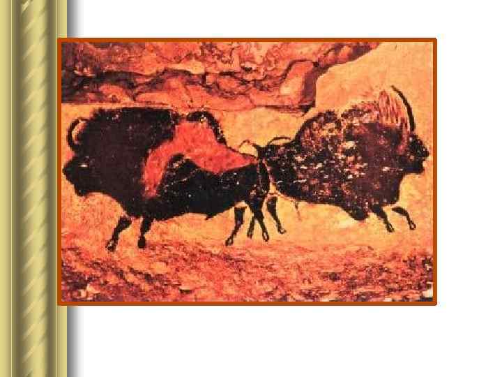 Вершина искусства - пещерная живопись. Наиболее известная галерея – Альтамира (север Испании). l Изображения: бизонов, кабанов, лошадей, нарисованных черной, желтой и красной красками. Нет композиции (многие фигурки нарисованы практически друг на друге и к верх ногами). l Но животные воссозданы точно в деталях (еще не знали эстетического обобщения и могли запечатлевать только фотографически