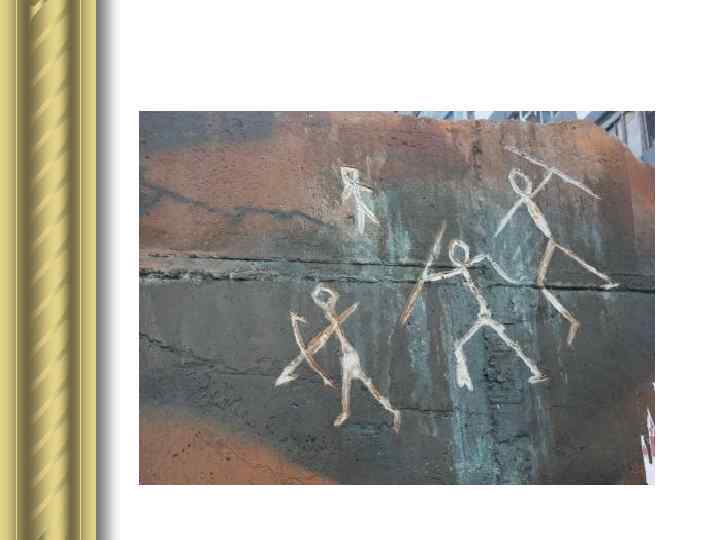 ИСКУСТВО НЕОЛИТА l - Живопись всё более схематична и условна, преобладают символы, абстракция и стилизация l Встречаются разнообразные геометрические фигуры (круги, прямоугольники, ромбы и спирали и т. д. ) l Изображения оружия (топоры и кинжалы) и средств передвижения (лодки и корабли) l Широко распространяются петроглифы – наскальные изображения, выполненные в ударной технике