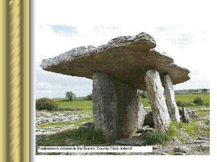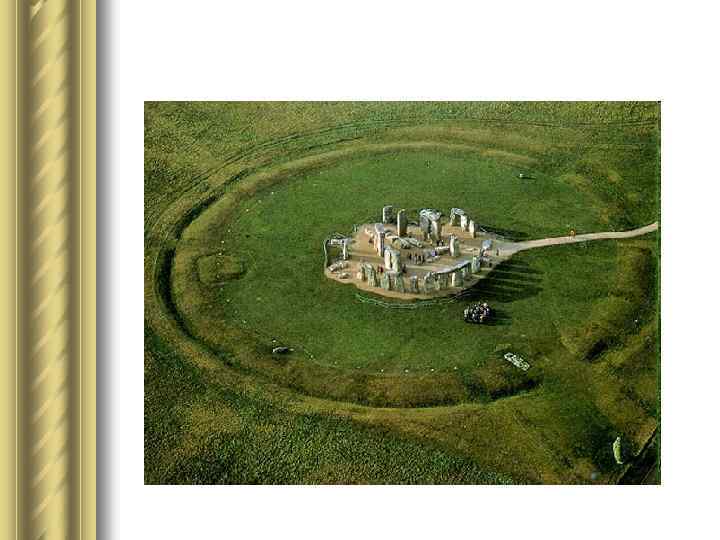 Типы мегалитических сооружений l Менгиры – вертикально поставленные обработанные или необработанные камни. Достигали высоты 20, 5 м и массы 300 т. айдены в Испании, Армении, на Кавказе, в Сибири. l Дольмены – композиция из 2 -х и более опорных камней покрытых плитой (прототип стоечно-балочной конструктивной системы). Места распространения – Северный Кавказ. l Кромлехи – каменные плиты или столбы расположенные по кругу. Самый знаменитый – Стоунхендж в Англии (состоит из 2813 камней высотой до 15 м и весом до 40 т)