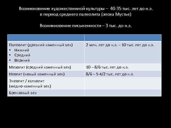 Возникновение художественной культуры – 40 -35 тыс. лет до н. э. в период среднего палеолита (эпоха Мустье) Возникновение письменности – 3 тыс. до н. э. Палеолит (древний каменный век) • Нижний • Средний • Верхний 2 млн. лет до н. э. – 10 тыс. лет до н. э. Мезолит (средний каменный век) 10 – 8/6 тыс. лет до н. э. Неолит (новый каменный век) 8/6 – 5 -4/2 тыс. лет до н. э. Энеолит / халколит (медно-каменный век) Бронзовый век