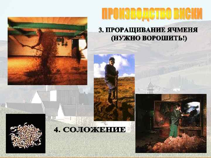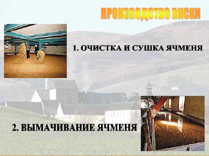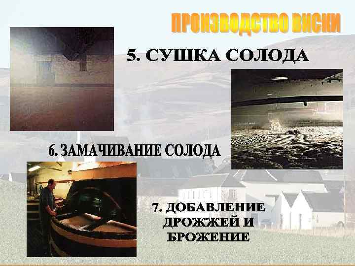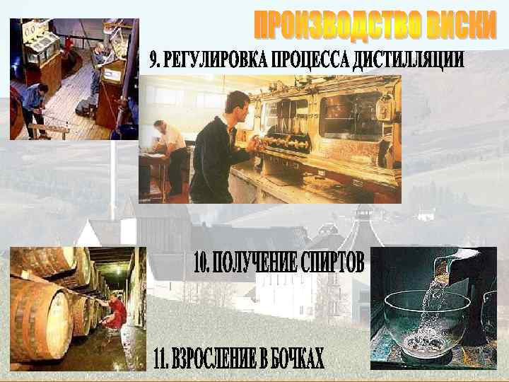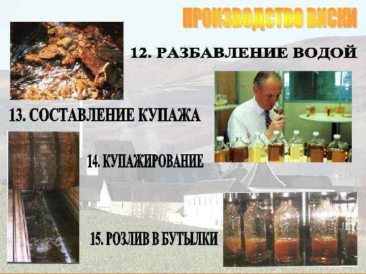 q Single Malt (односолодовый виски) Классический шотландский виски. Обычно такой виски называется так же, как и винокуренный завод, где он был изготовлен. Single malt всегда производится только на одном винокуренном заводе. q Pure Malt (чистосолодовый виски) Смесь различных сортов single malt, произведенных на разных винокуренных заводах. Этот вид виски производится для того, чтобы нейтрализовать достаточно резкий вкус некоторых single malt добавлением односолодового виски с более мягким вкусом, что также увеличивает присутствие различных ароматов. Pure malt может называться также vatted malt (вэтид молт) q Blend (купажированный виски) Это результат смешивания от 15 до 40 различных single malt и 2 или 3 сортов зернового виски (виски из кукурузы, пшеницы, ржи), причем single malt составляют от 20 до 40% от общего объема купажа. Имеет более нейтральный, мягкий вкус, нравится большему количеству людей. На него приходится 90% продаж всех скотчей. q Blend de Luxe – купажированный виски, выдержка которого составляет 12 лет, содержащий не менее 40% спиртов single malt. q Grain Whisky – производится из несоложеного зерна (ячмень, пшеница, кукуруза). К зерну обязательно добавляется 1/9 соложеного ячменя.