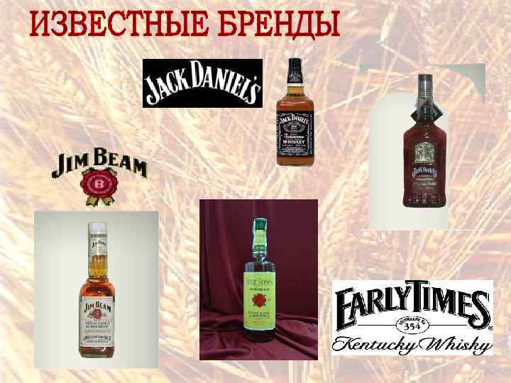 Главная особенность американского виски – это использование кукурузы и ржи вместо солода, а также выдержка в новых обожженных бочках, которые придают напитку золотистый цвет и сладковатый привкус. Различают два основных типа американского виски: STRAIGHT "Прямой" виски - это зерновой дистиллят, приготовленный из смеси, в состав которой входит минимум 51% какого-то одного злака, а оставшиеся 49% могут состоять из других злаковых. В "прямом" виски не допускается использование нейтрального спирта и каких -либо добавок. BLENDED "Купажированный" - смесь нескольких сортов виски.