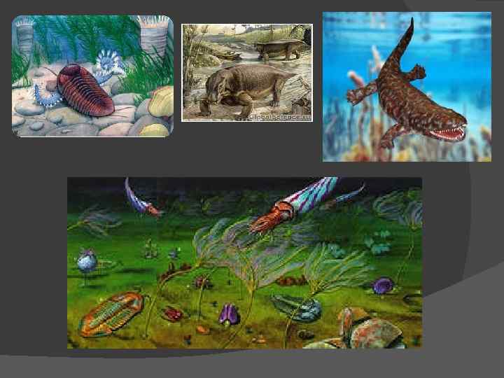 Ископаемые животные Освоение суши животными началось в силуре (445— 400 млн. лет назад) одновременно с появлением наземных растений: Из позднего силура известны первые представители скорпионов. (В силуре наблюдалась некоторая засушливость климата) В конце девона (400— • 345 млн. лет назад) появились первые позвоночные — архаичные земноводные. (Климат становится тёплым и влажным. Моря заливали впадины. ) В карбоне (345— 280 млн. лет назад) на суше уже доминировали из беспозвоночных — насекомые, из позвоночных — примитивные пресмыкающиеся и земноводные. (климат влажный, большая концентрация СО 2, усиленное горообразование) В мезозойскую эру (триас, юра и мел; 230— 66 млн. лет назад) господствовали пресмыкающиеся. (деление Гондваны, климат менялся от влажного и тёплого к засушливому) В середине триаса (230— 195 млн. лет назад) появились динозавры, а в самом конце — млекопитающие. Птицы известны с конца юры (195— 136 млн. лет назад). В конце мела (136— 66 млн. лет назад) вымерли многие группы морских беспозвоночных, морских и наземных пресмыкающихся, включая динозавров.
