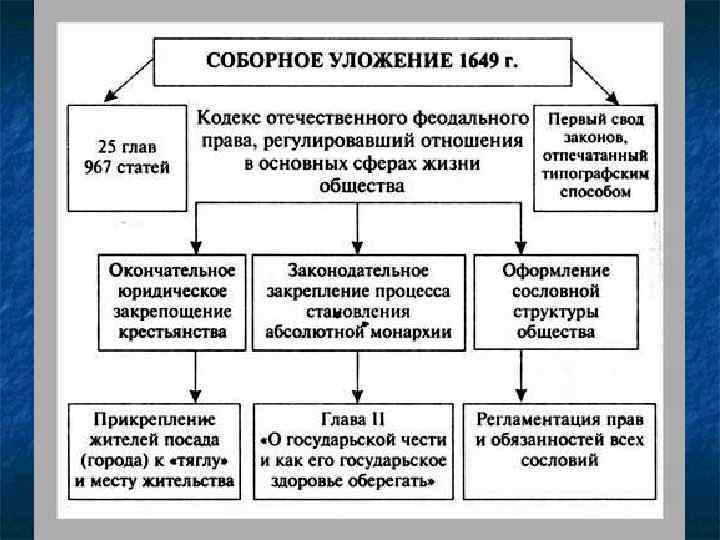 Соборное уложение 1649 г. окончательно оформило крепостное право — устанавливалась вечная потомственная зависимость крестьян, отменялись «урочные лета» для сыска беглых крестьян, за укрывательство беглых устанавливался высокий штраф. Помещичьи крестьяне лишались права судебного представительства по имущественным спорам. Посадское население (т. е. горожане) прикреплялось к посадам и также облагалось государственными налогами и податями. Предусматривался сыск беглых посадских людей. Соборное уложение также ликвидировало «белые слободы» - городские районы, принадлежавшие светским землевладельцам или монастырям, население которых было освобождено ( «обелено» ) от уплаты посадских государственных податей. На ликвидации «белых слобод» настаивали прежде всего посадские люди, нёсшие более тяжёлые повинности.