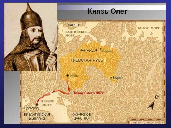 Внешняя политика. 907 –поход на Византию. Снарядив 2000 ладей по 40 воинов в каждой (Повесть временных лет), Олег выступил в поход на Царьград. Византийский император Лев VI Философ приказал закрыть ворота города и загородить цепями гавань, предоставив таким образом варягам возможность грабить и разорять пригороды Константинополя. Однако Олег пошёл на необычный штурм: «И повелел Олег своим воинам сделать колёса и поставить на колёса корабли. И когда подул попутный ветер, подняли они в поле паруса и пошли к городу» . Испуганные греки предложили Олегу мир и дань. В знак победы Олег прибил свой щит на вратах Царьграда. Главным результатом похода стал торговый договор о беспошлинной торговле Руси в Византии.