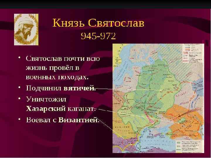 Святослав 962 972 гг. Деятельность: Завершение процесса объединения восточнославянских племен после подчинения вятичей. Активная внешняя политика Киевской Руси. Стремление расширить территорию Руси и обеспечить безопасность восточных торговых путей для русских купцов. Разгром Волжской Болгарии и Хазарского каганата. Война и разгром Дунайской Болгарии, переход к Руси земель, расположенных по нижнему течению Дуная. 970 971 гг. русско византийская война; поражение Руси. Подписание мирного договора Русь обязывалась не нападать на Византию и Болгарию. Византия признавала за Русью её завоевания в Поволжье и Причерноморье Расширение и укрепление границ Киевской Руси Святослав Игоревич (957 -972) киевский князь, первым из Рюриковичей носивший славянское имя, сын Игоря и Ольги.
