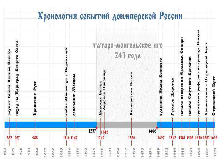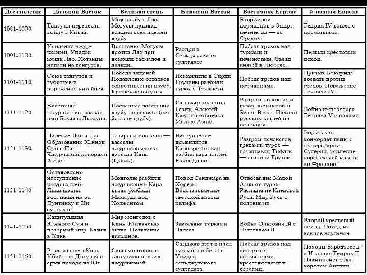Хронологическая таблица по истории России 11 век Годы События n n n n n 1019– 1054 Княжение Ярослава Владимировича Мудрого в Киеве. Составление свода законов «Правда Ярослава» — наиболее древней части «Русской правды» . 1024 Восстание в Ростово-Суздальской земле; подавлено князем Ярославом. 1024 Раздел Руси между Ярославом Мудрым и его братом Мстиславом по Днепру: Правобережье (с Киевом) отходило к Ярославу, Левобережье (с Черниговом) — к Мстиславу. 1030– 1035 Строительство Спасо-Преображенского собора в Чернигове. 1036 Победа князя Ярослава Мудрого над печенегами. 1043 Поход Руси (во главе с сыном Ярослава Мудрого князем Владимиром Ярославичем Новгородским) на Константинополь; завершился неудачей. 1045– 1050 Строительство Софийского собора в Новгороде. 1051 Поставление князем Ярославом Мудрым автора «Слова о Законе и Благодати» Илариона (первого из русских) на митрополичью кафедру в Киеве. Основание отшельником Антонием Печерской обители в Киеве. 1054 Великое княжение в Киеве Изяслава Ярославича. Составление «Правды Ярославичей» — второй части «Русской правды» 1068 Набег половцев на Русь. Поход русских князей (Ярославичей) на половцев и их поражение на р. Альта. Восстание горожан в Киеве. Бегство Изяслава в Польшу. Около 1071 Восстания в Новгороде и Ростово-Суздальской земле. 1072 Перенесение в новую церковь г. Вышгорода мощей князей Бориса и Глеба (сыновей князя Владимира I), убитых сторонниками князя Святополка, ставших первыми русскими святыми. 1073 Изгнание князя Изяслава из Киева. 1073– 1076 Великое княжение в Киеве Святослава Ярославича. 1078– 1093 Великое княжение в Киеве Всеволода Ярославича 1093– 1113 Великое княжение в Киеве Святополка Изяславича 1093 Поражение князей Святополка и Владимира Всеволодовича Мономаха в битве с половцами на р. Стугна 1096 Победа князя Святополка над половцами в битве под Переяславлем. 1097 Съезд князей в г. Любеч.