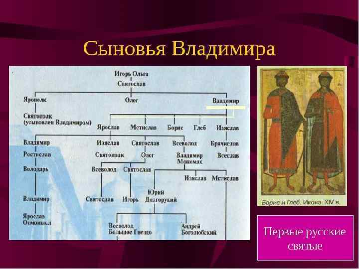 Ярославичи ЯРОСЛАВ МУДРЫЙ ВЛАДИМИР ИЗЯСЛАВ РОСТИСЛАВ СВЯТОПОЛК ВЛАДИМИР ВАСИЛЬКО ВСЕВОЛОД СВЯТОСЛАВ ОЛЕГ ДАВЫД ВЛАДИМИР МОНОМАХ ВЯЧЕСЛАВ ИГОРЬ БОРИС ДАВЫД