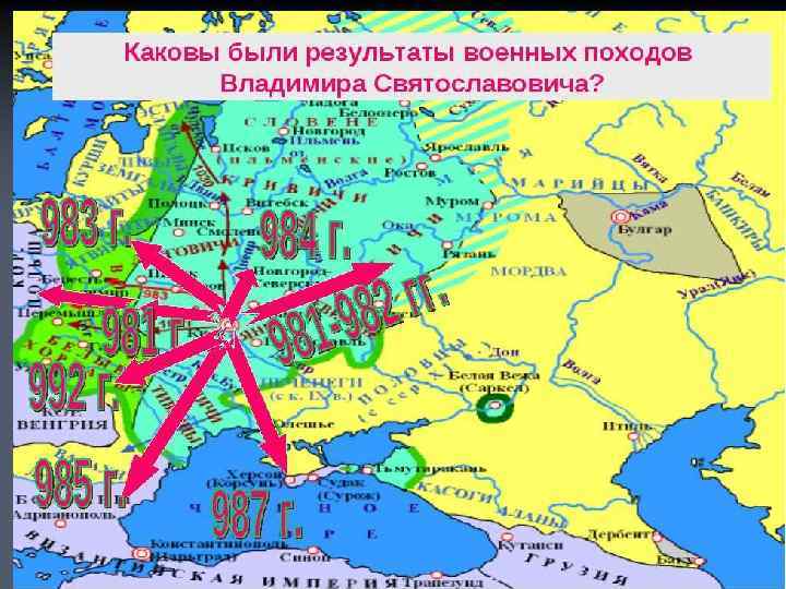 Мирный договор с Болгарией. Нижнее течение Дуная с сильной крепостью Переяславец отошло к Руси. 967 969 -971 Святослав Поход на Дунай Русско-византийская война 981 Владимир Поход на Польшу 981 -984 Владимир Походы на вятичей, радимичей, ятвягов, 985 Владимир Поход на Болгарию Русские покинули Дунай. Все прежние завоевания в Причерноморье и Поволжье оставались за ними. Присоединение Червенских городов (Закарпатье). Обложение данью. Подтверждение могущества Руси. Предпосылки для принятия христианства. 987 992 Владимир Поход на византийское владение – Херсонес Таврический Поход в Карпатские горы Подчинение и обложение данью племён хорватов.
