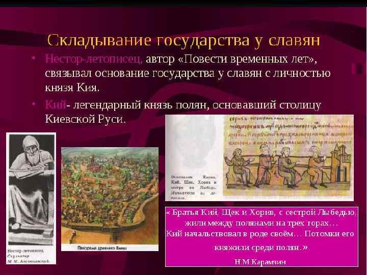 Любечский съезд «В лето 1097. Пришли Святополк, и Владимир, и Давид Игоревич, и Василько Ростиславич, и Давыд Святославич, и брат его Олег и собрались в Любече для устроения мира (между собой). И обращались к себе, говоря: «Зачем губим Русскую землю, сами на себя вражду воздвигая, а половцы землю нашу терзают на части и радуются, что между нами войны и доныне. С этого времени соединимся в одно сердце и будем охранять Русские земли. Пусть каждый держит отчину свою. . . и на том целовали крест: если кто пойдет на кого (войной), то на того будем все. . . » , и, принеся клятву, разошлись восвояси. . . »