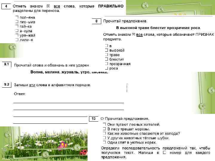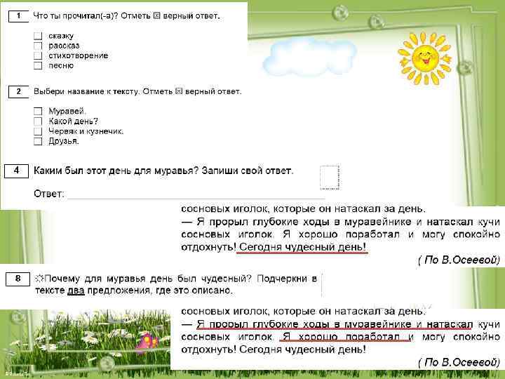 1. Понимать текст (8) ü опираясь не только на содержащуюся в нём информацию, но и на жанр, структуру, язык 2. Подбирать заголовок (7) ü соответствующий содержанию и общему смыслу текста 4. Определять основные события (5) и устанавливать их последовательность 8. Отвечать на вопросы и задавать вопросы (8) по содержанию произведения; находить в тексте требуемую информацию (конкретные сведения, факты, заданные в явном виде)