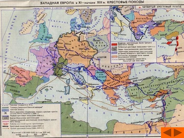 Работа с картой «Западная Европа в XI начале XIIIвв. Крестовые походы» , ► Каким знаком на карте обозначен первый Крестовый поход? ► Стрелочкой ► Жители каких европейских государств приняли участие в первом Крестового походе? ► Франции, Германии, Италии ► Покажите путь участников похода