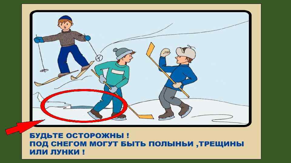 Главная опасность на реке или пруду зимой – это непрочный и тонкий лед. Избегай мест, где лед может быть тонким.