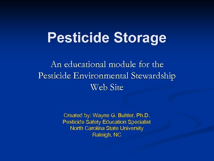Pesticide Storage An educational module for the Pesticide Environmental Stewardship Web Site Created by: Wayne G. Buhler, Ph. D. Pesticide Safety Education Specialist North Carolina State University Raleigh, NC